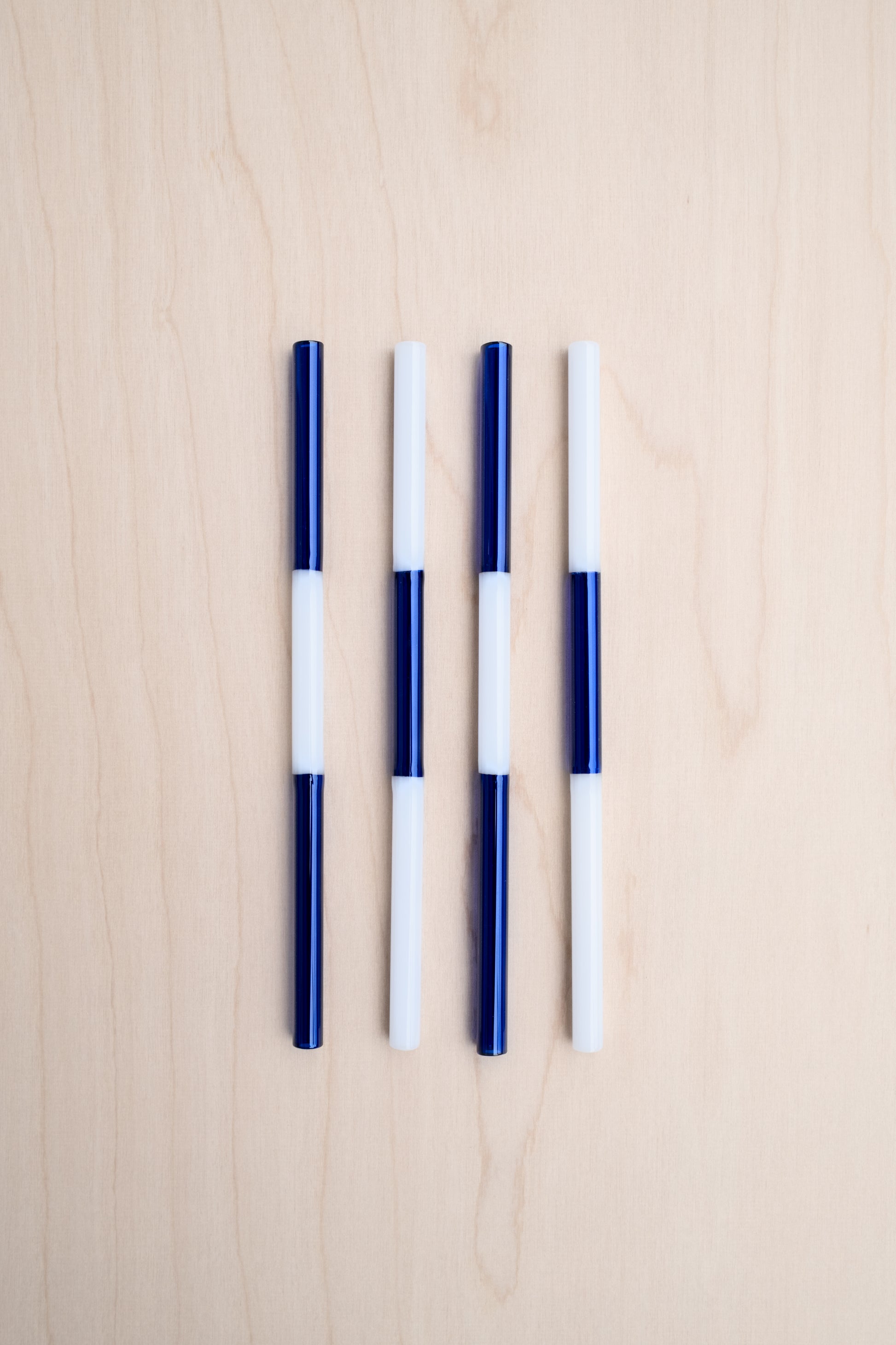 Set of four (4) Multicolor borosilicate glass straws. Hand made in Austin, Texas. Approximately 8". Dishwasher safe. Each Colorblock Straw is made of scrap glass from the other straw designs, making each straw unique and zero-waste!