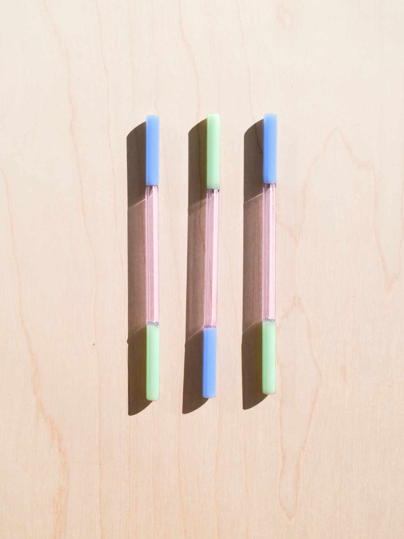 Set of three (3) Multicolor borosilicate glass straws. Hand made in Austin, Texas. Approximately 8". Dishwasher safe. Each Colorblock Straw is made of scrap glass from the other straw designs, making each straw unique and zero-waste!